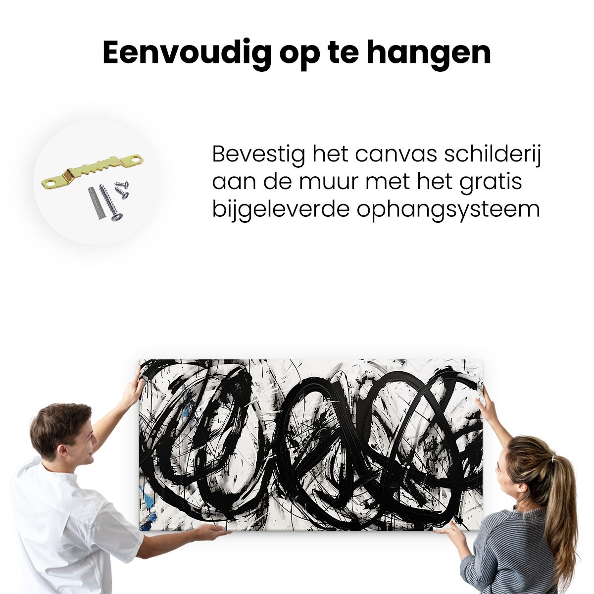 Bij aankoop ontvang je een meegeleverd ophangsysteem, zodat je op een simpele en snelle wijze het schilderij boven de bank of bed kan monteren.