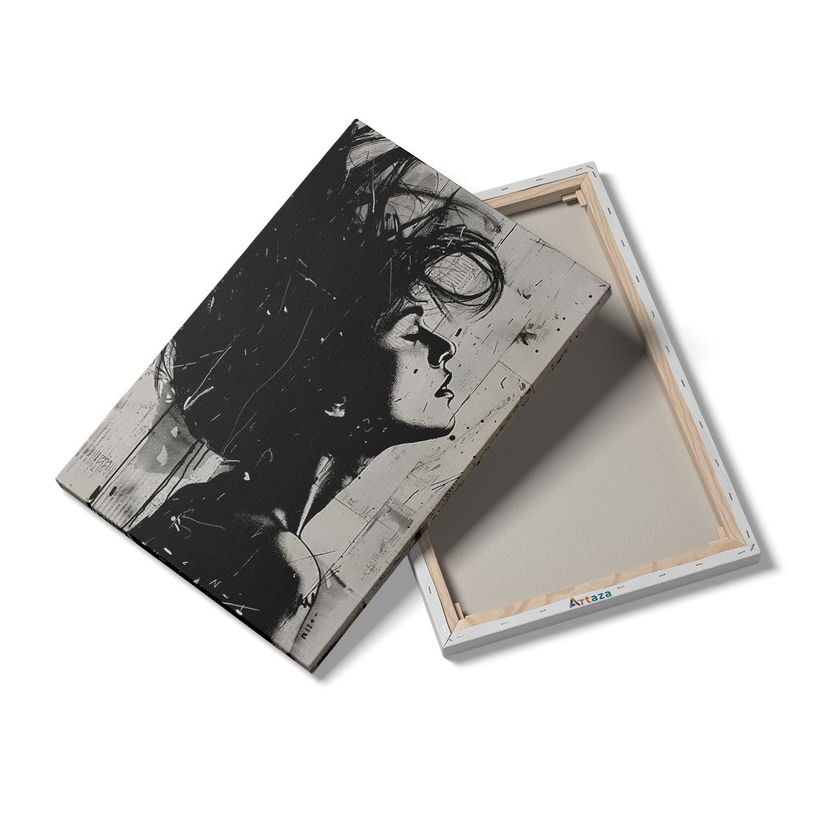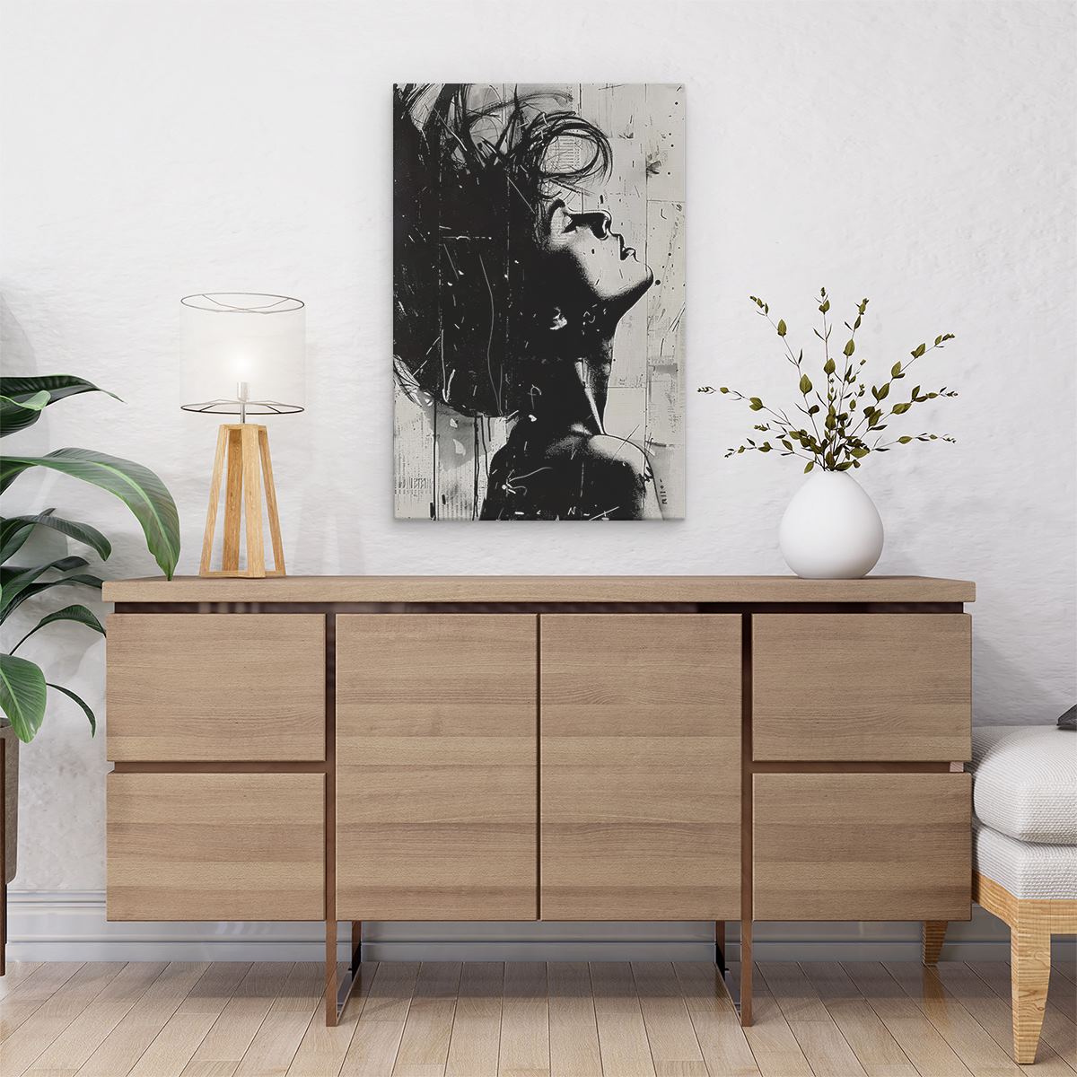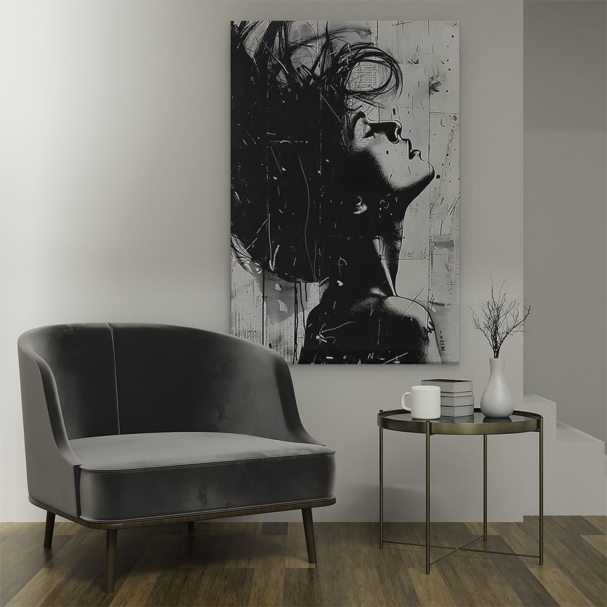 Schilderij Zwart Wit Kunstwerk van een Vrouw met haar Haren Wapperend in de Wind