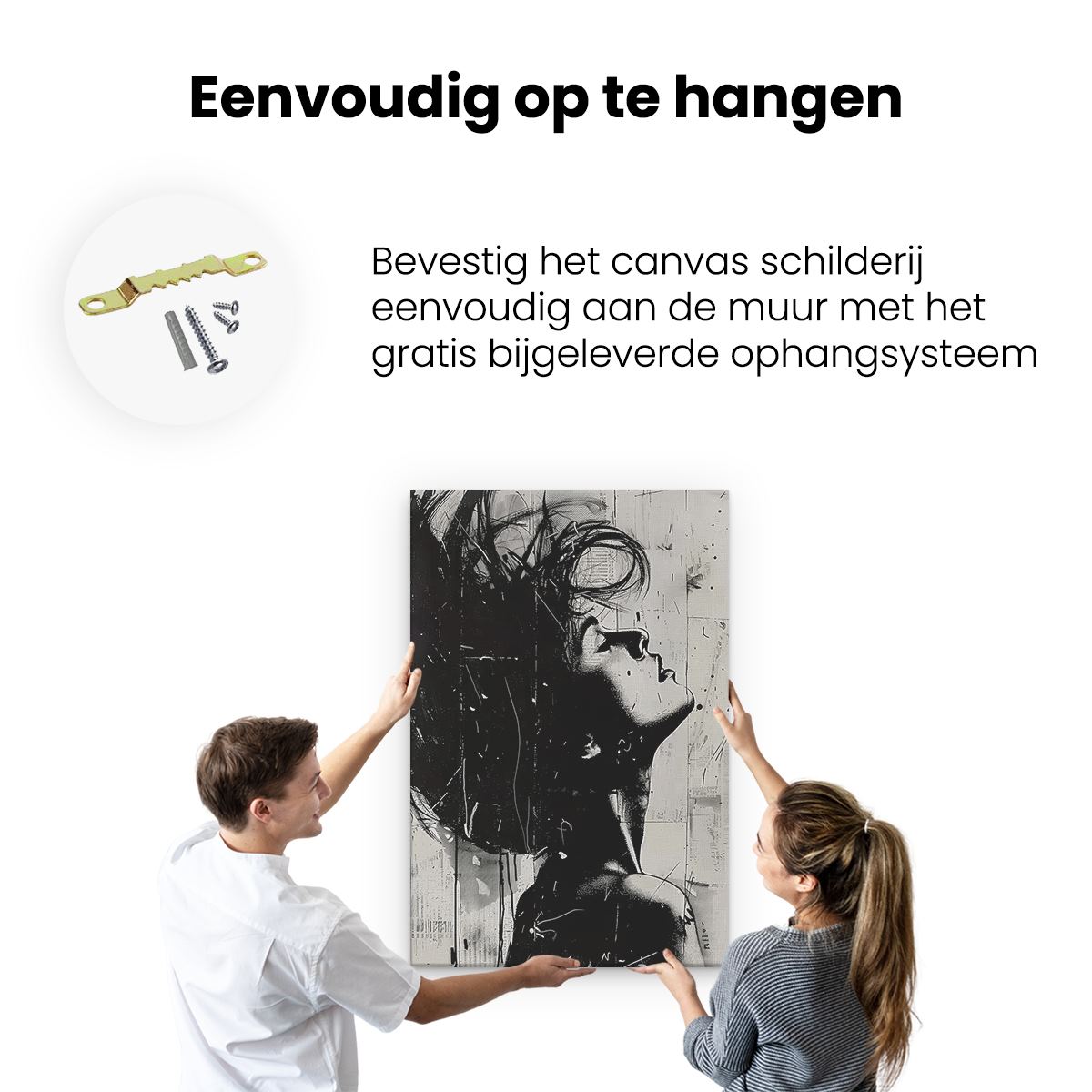 Bij aankoop ontvang je een meegeleverd ophangsysteem, zodat je op een simpele en snelle wijze het schilderij boven de bank of bed kan monteren.