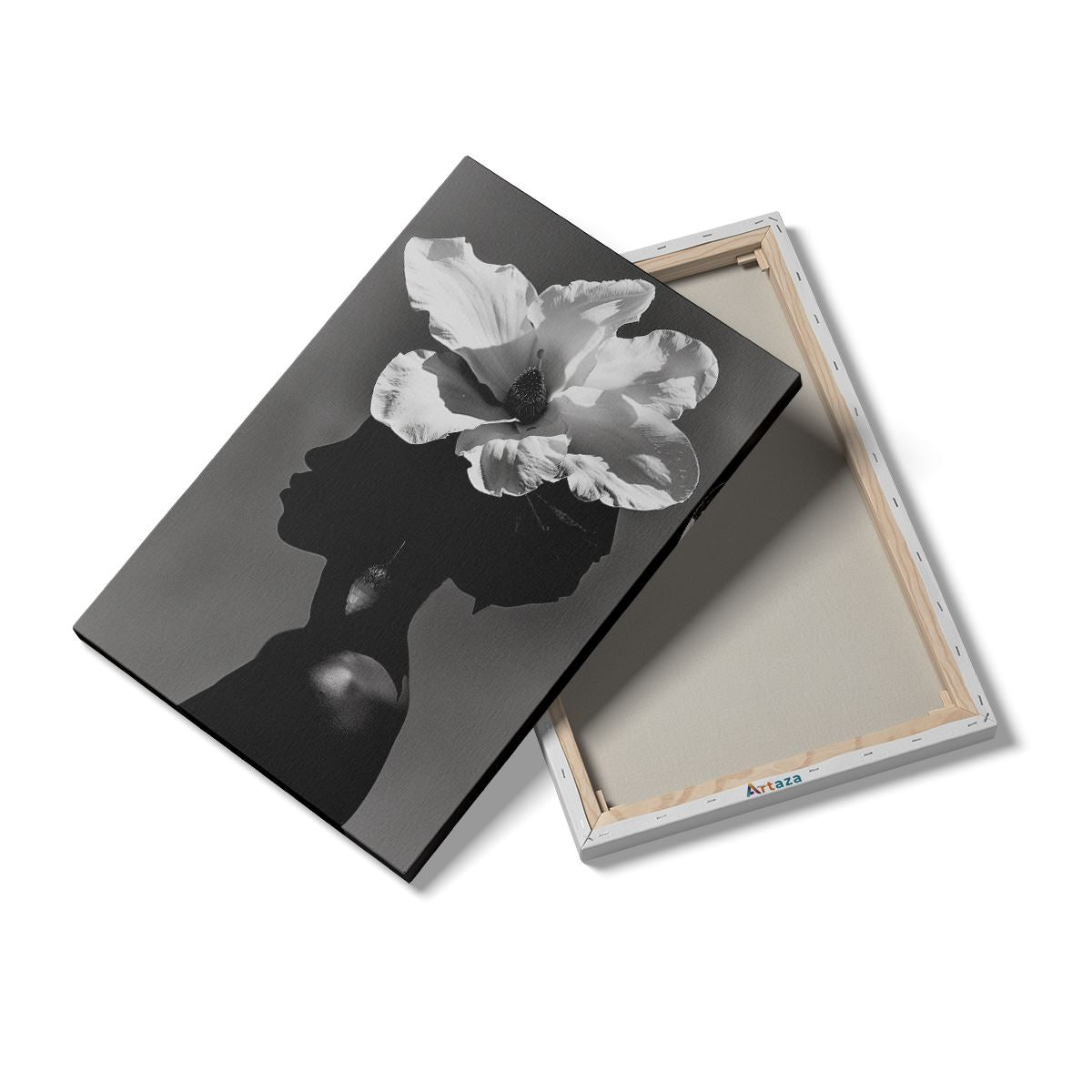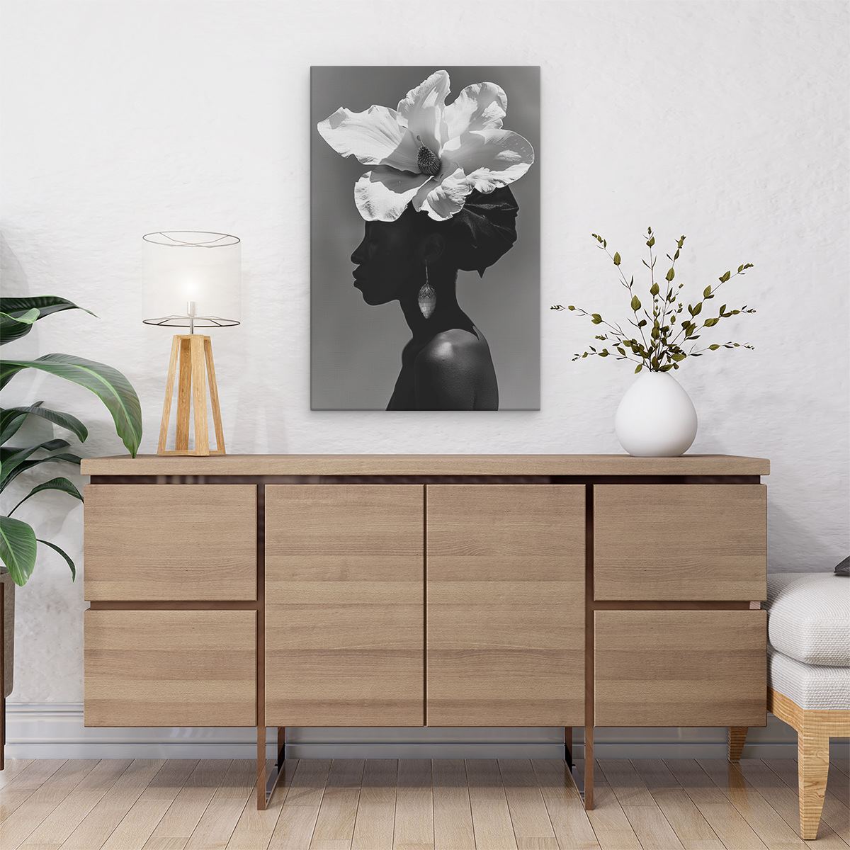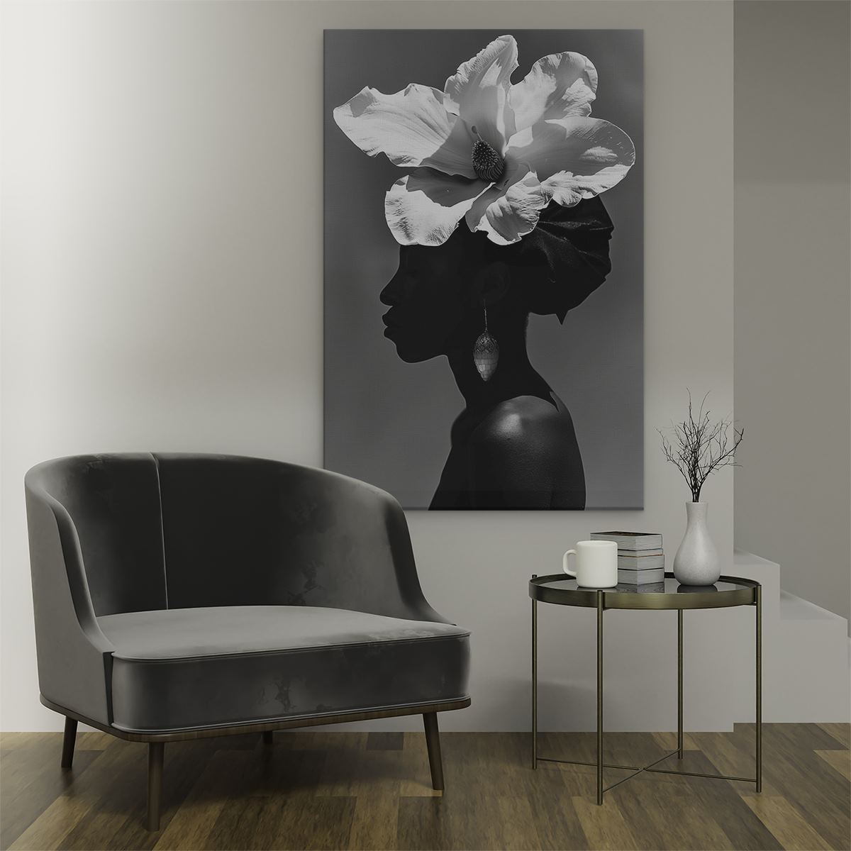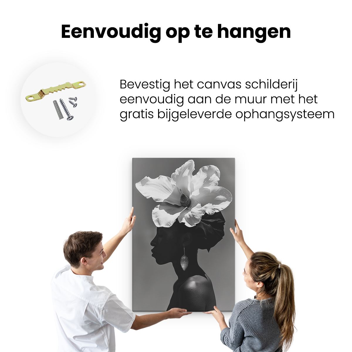 Schilderij Zwart Wit Portret van een Vrouw met een Bloem op haar Hoofd