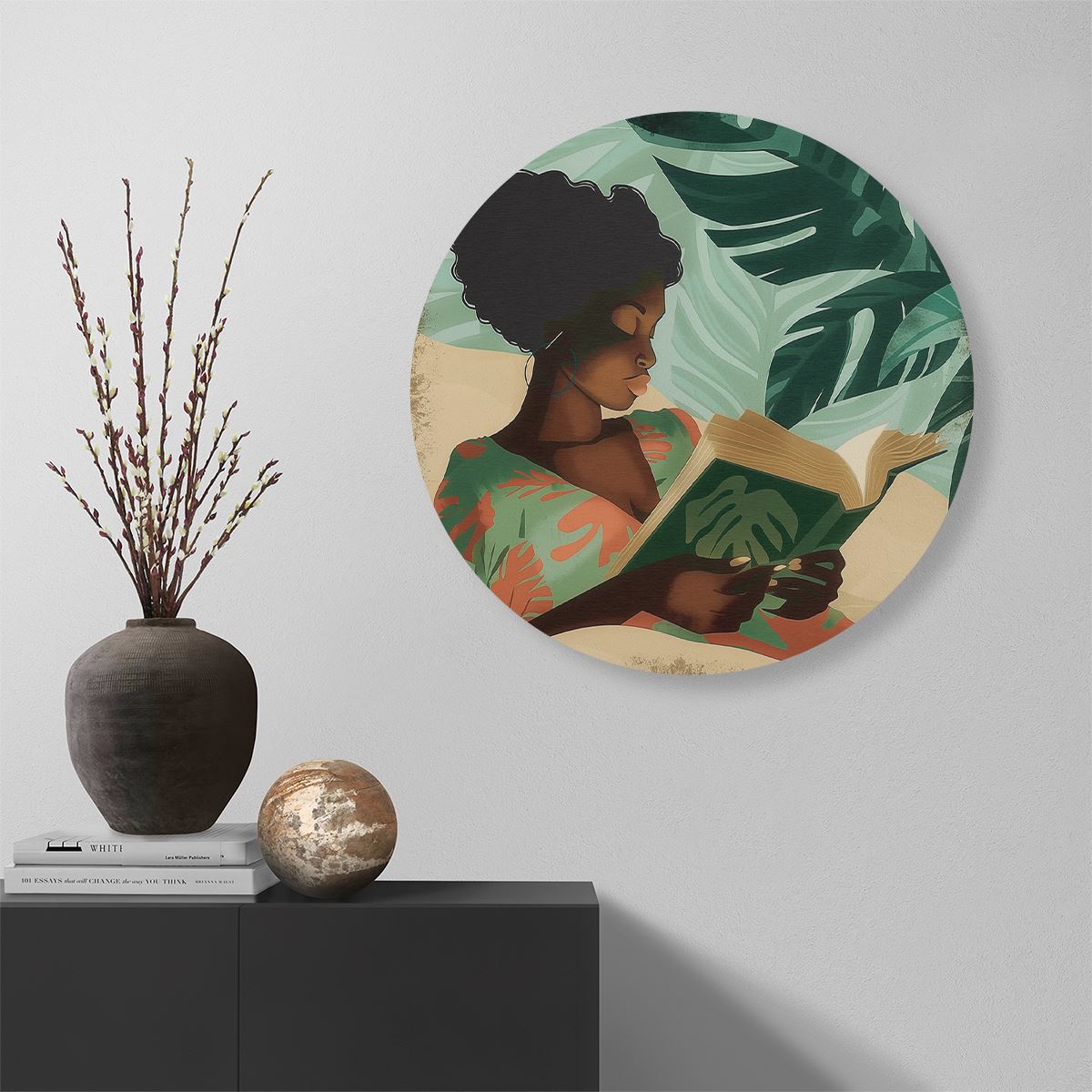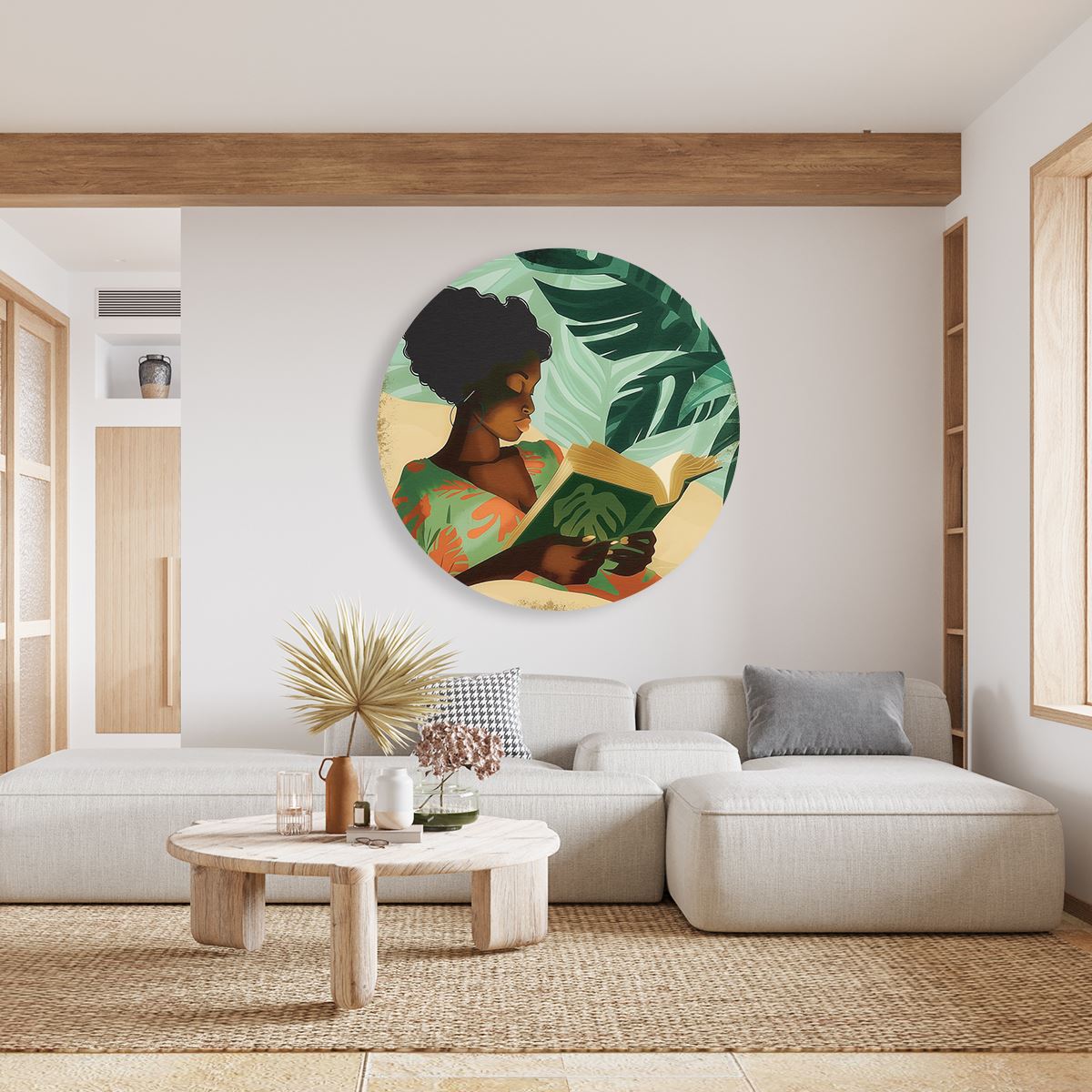 Wandcirkel Zwarte Vrouw die een Boek in het Zand Leest