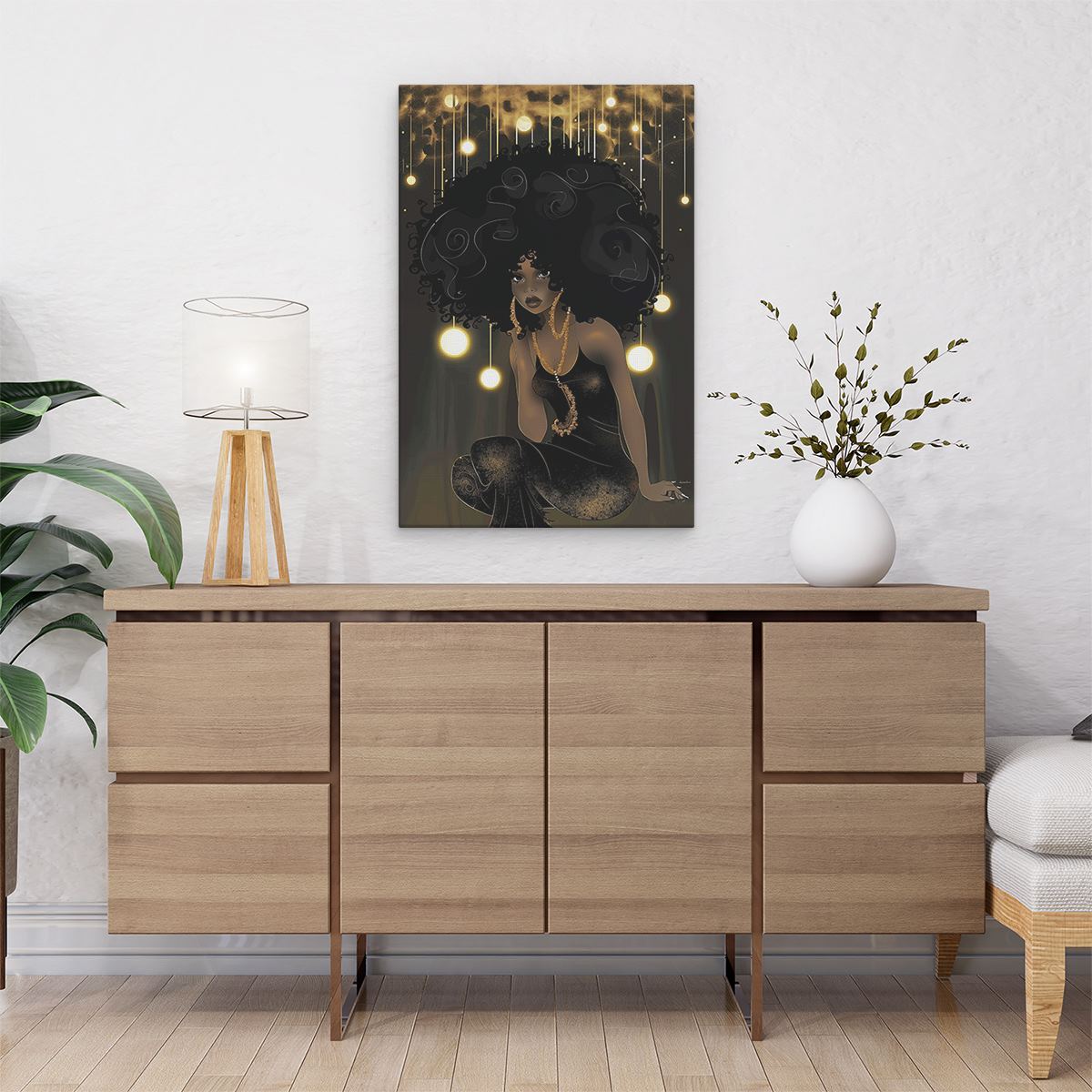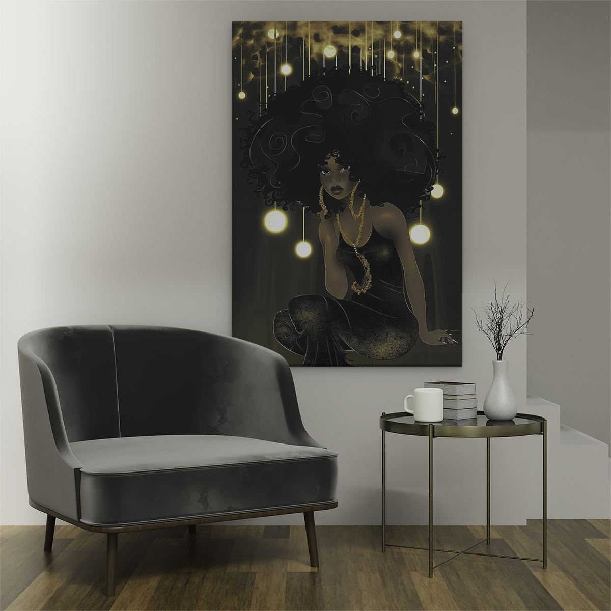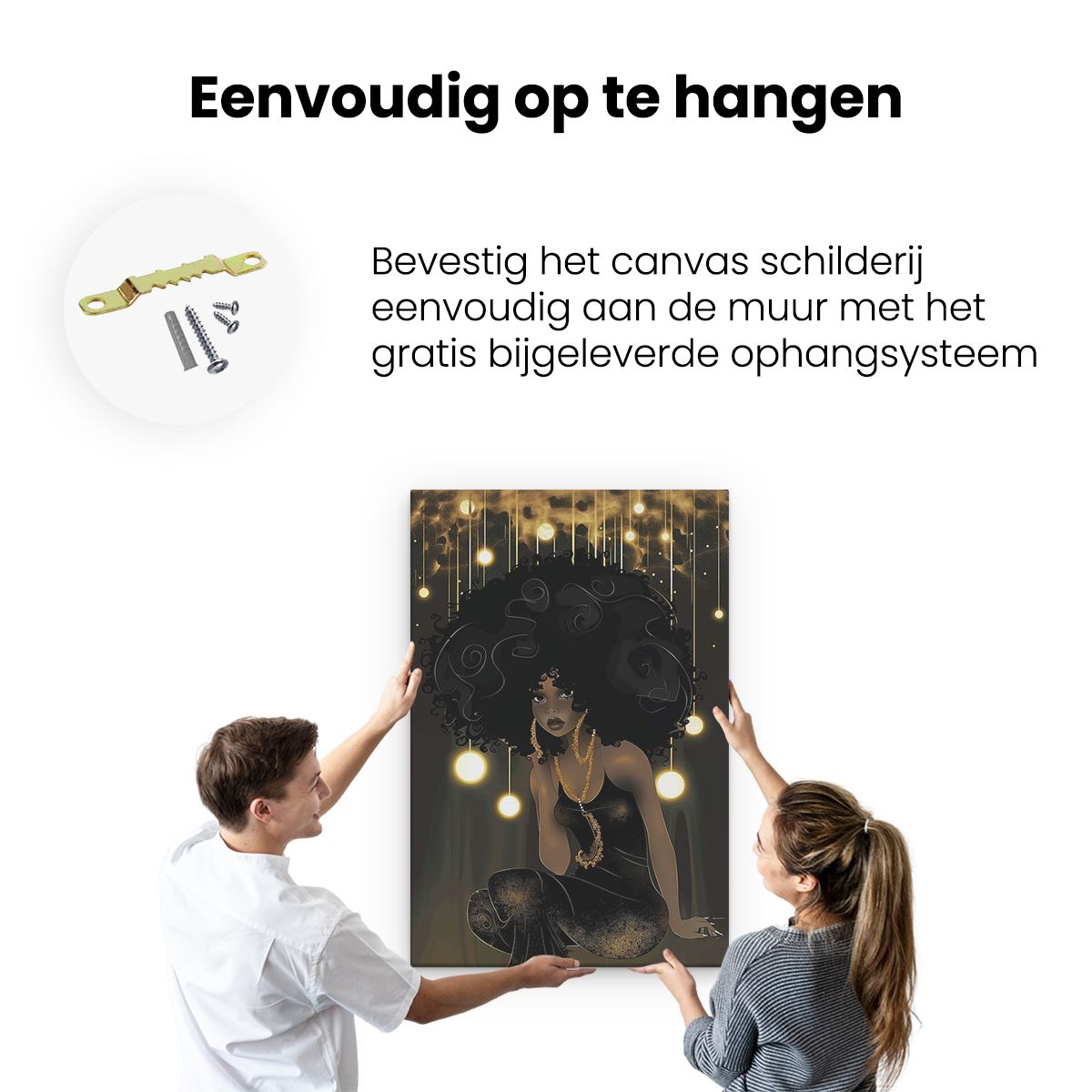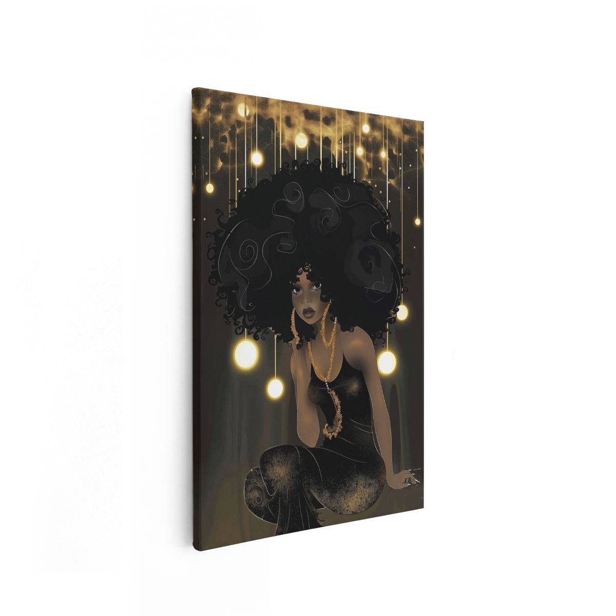 Schilderij Zwarte Vrouw in een Zwarte Jurk met Gouden Lichten