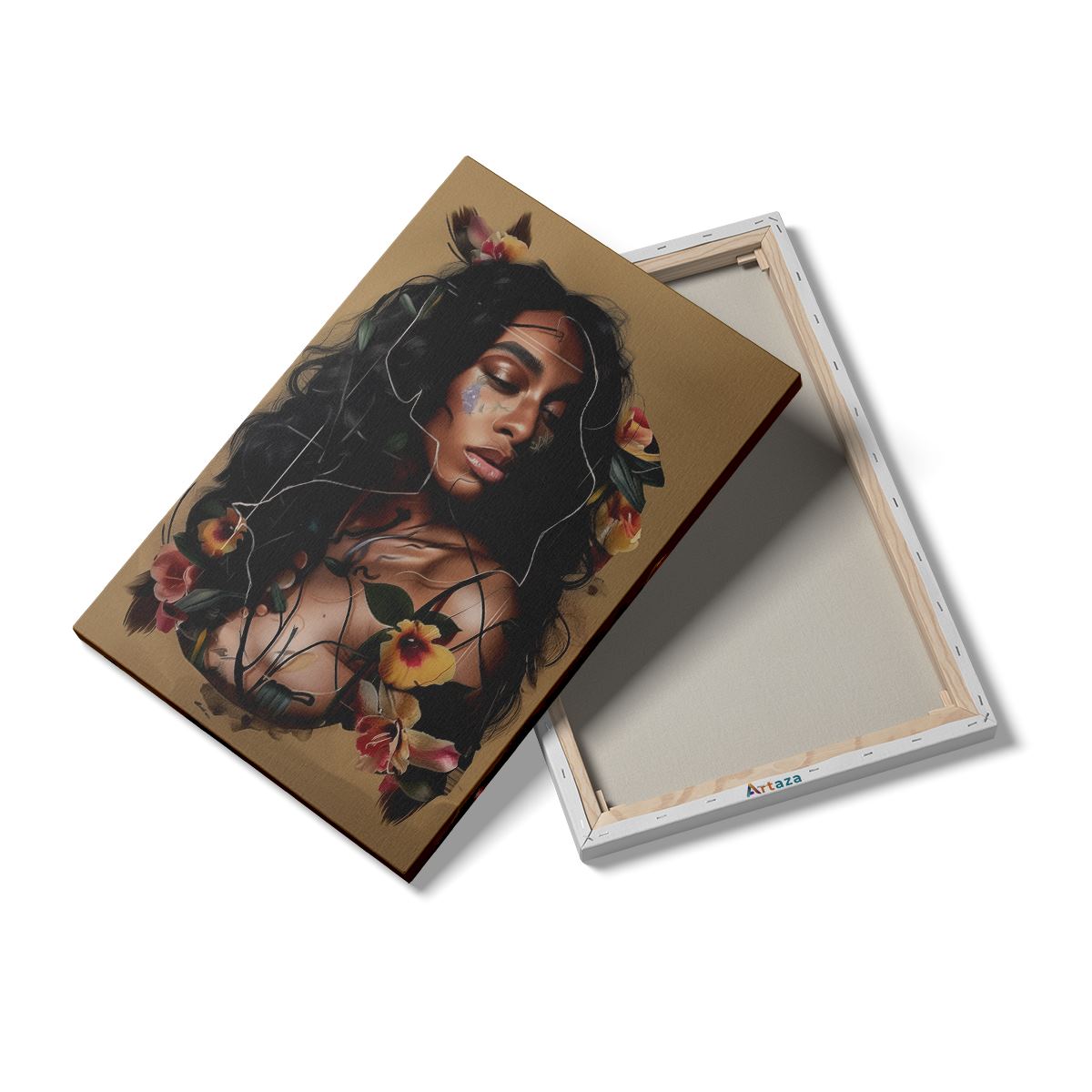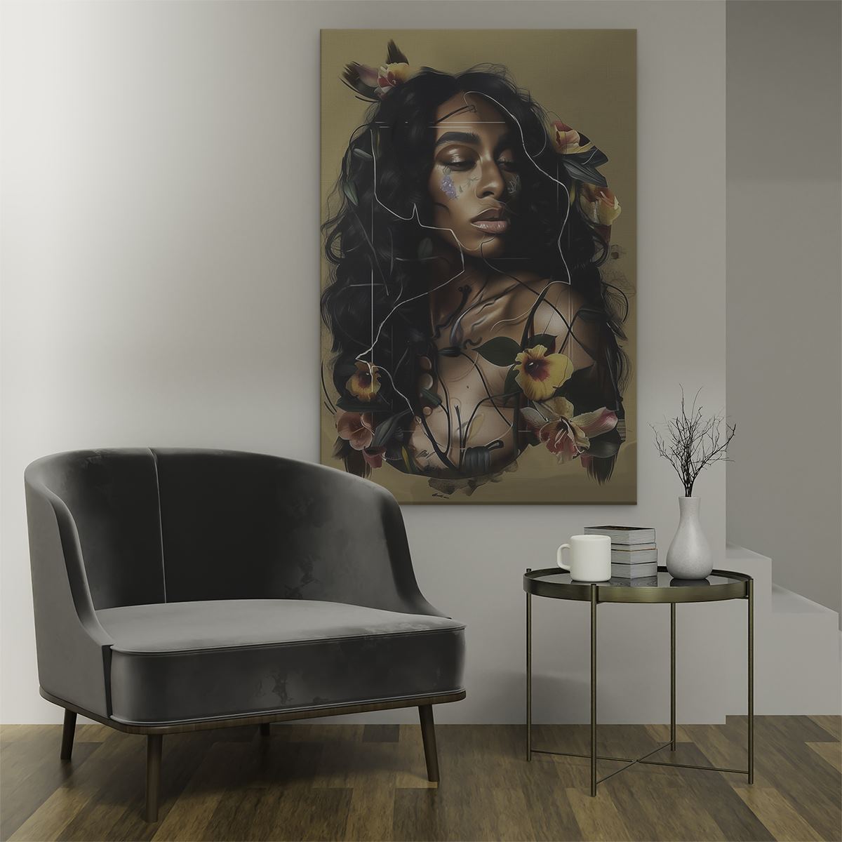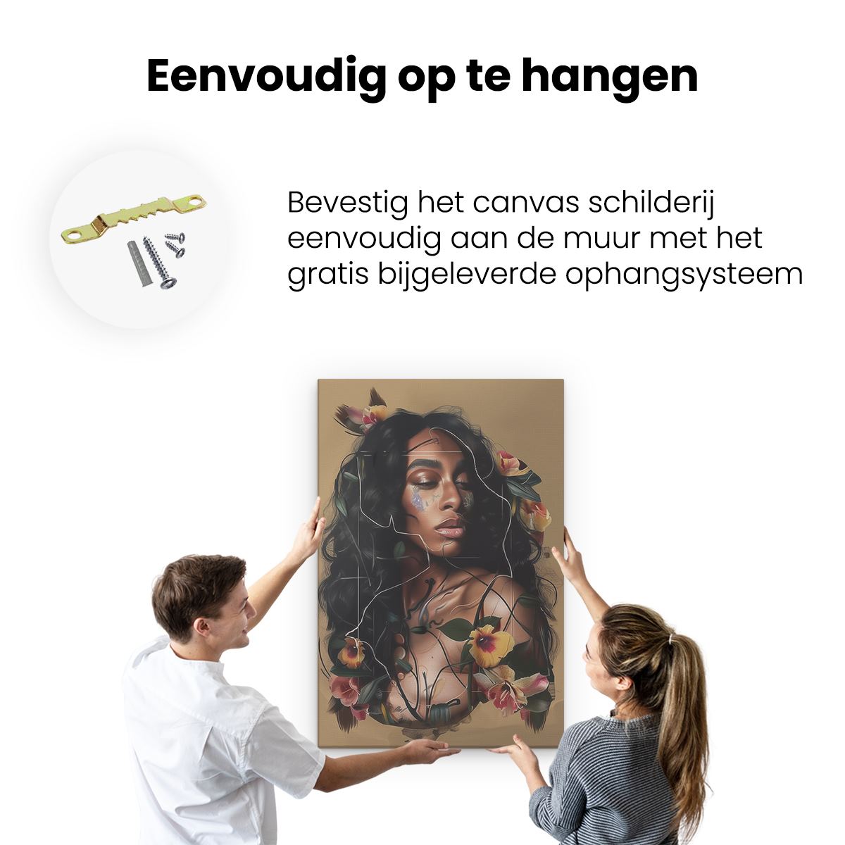 Schilderij Zwarte Vrouw met Bloemen op haar Gezicht