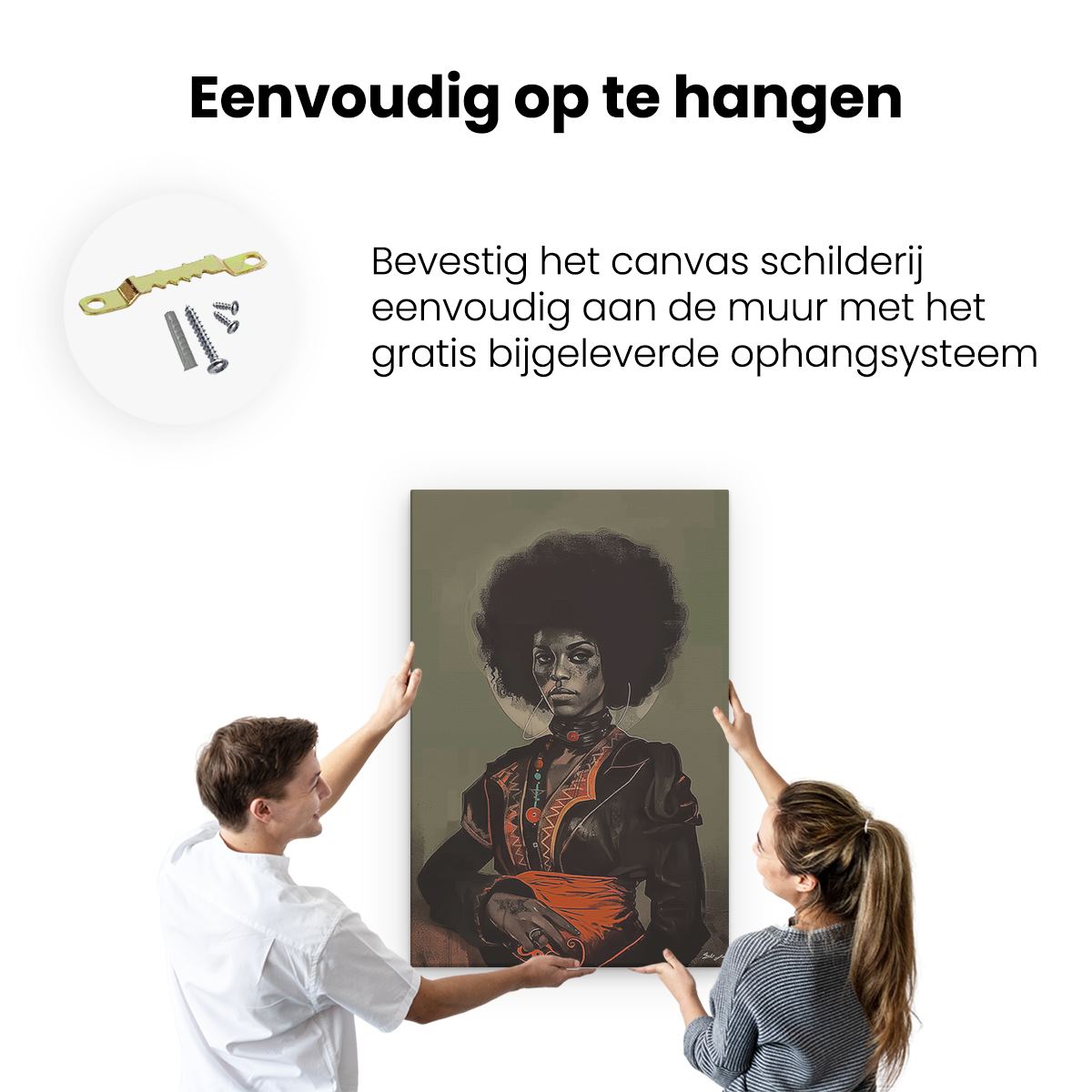 Bij aankoop ontvang je een meegeleverd ophangsysteem, zodat je op een simpele en snelle wijze het schilderij boven de bank of bed kan monteren.