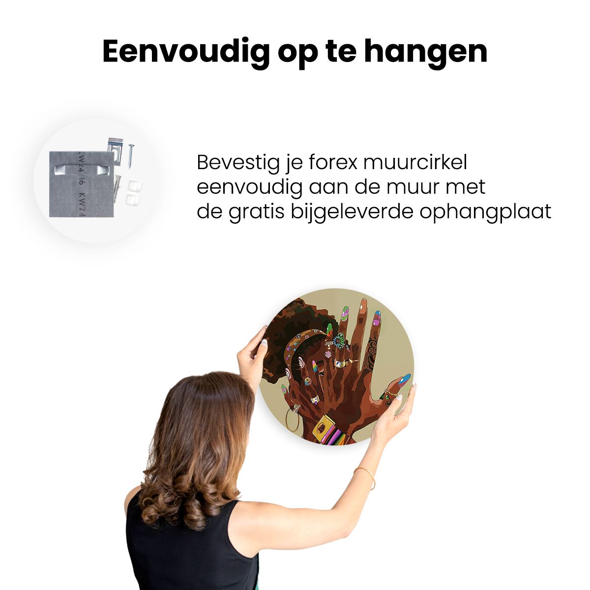 Gebruik het meegeleverde bevestigingsmateriaal om de wandcirkel aan de meeste wanden om te kunnen hangen. Een schroef en plug leveren we mee.